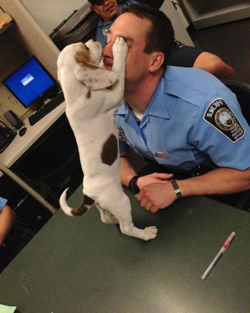 The puppy responded by jumping onto the table and smacking his paws over the officer’s face, earning a round of laughter from the other cops.