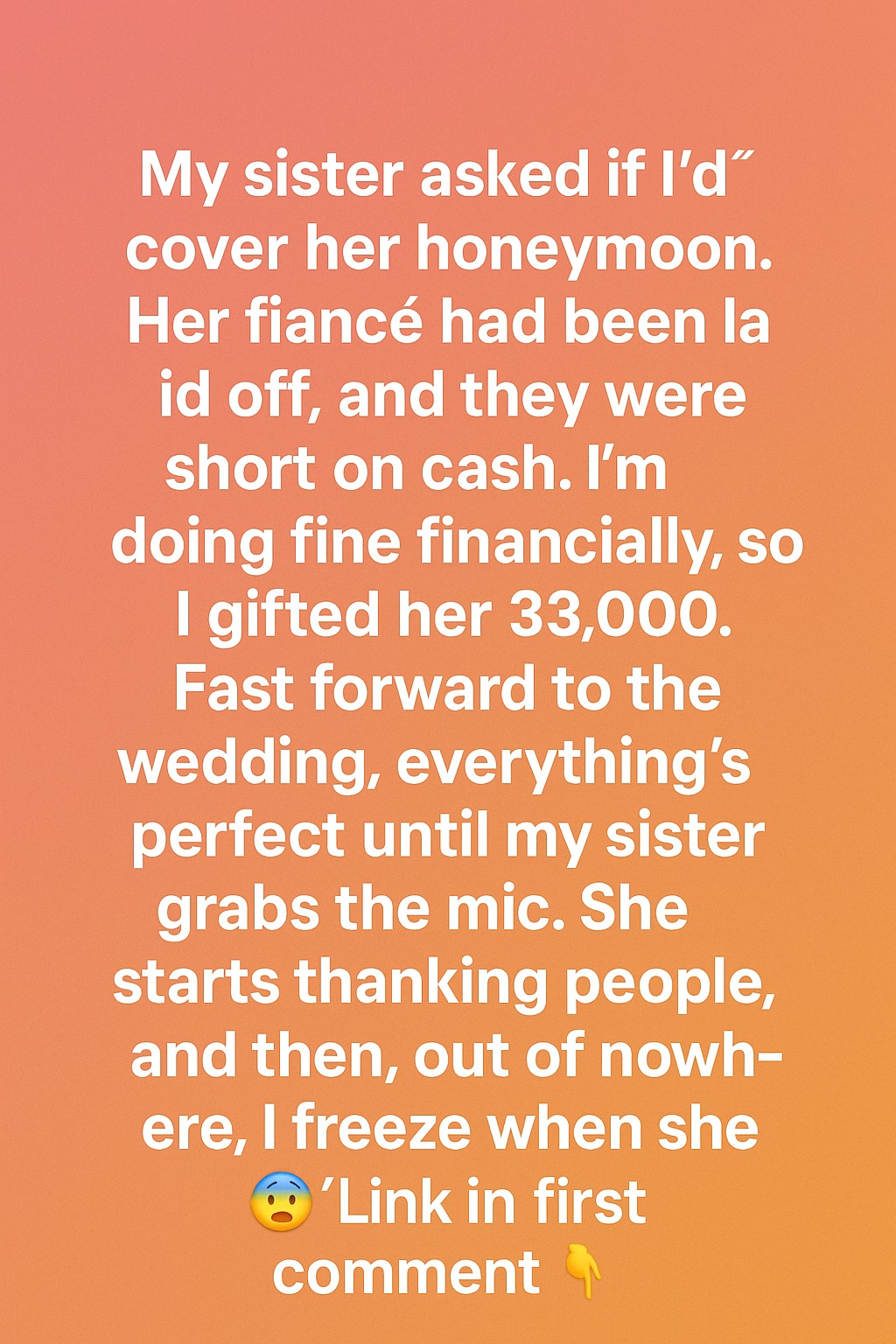 When the wedding day finally arrived, it was nothing short of magical. The ceremony was beautiful, the reception full of laughter and dancing, and the love in the room was undeniable. As the night went on, my sister stood up to thank everyone for being part of their celebration. To my surprise, she shared the story of my gift. The room filled with applause, and I sat there speechless as she expressed how much it meant to her. It was one of the most touching moments of my life.