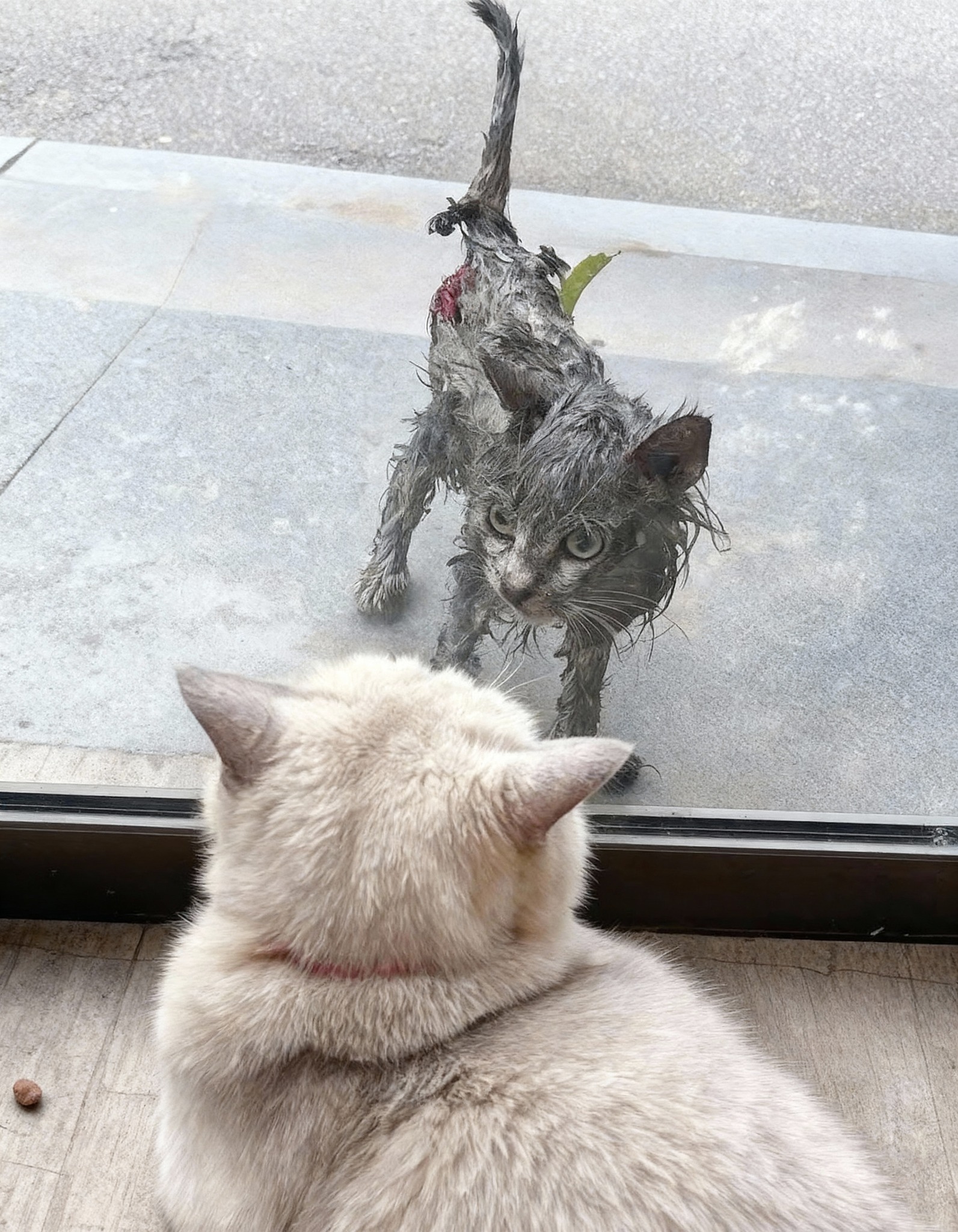 The rain lashed down, a relentless symphony against the cold pane of glass. Inside, Whiskers, a pristine cream-furred Persian with eyes like emeralds, stretched languidly on a plush cushion, utterly oblivious to the tempest outside. Her world was one of warmth, soft blankets, and the rhythmic purr of a well-fed cat. But on this particular Tuesday, a flicker of movement disturbed her serene solitude. Through the shimmering distortion of the rain-streaked window, a pair of desperate, wide green eyes met hers. It was Shadow, a scraggly, soot-grey tabby, drenched to the bone, its fur matted with grime, a stark silhouette of misery against the unforgiving street. A shiver, not of cold, but of something akin to recognition, traced Whiskers’ spine. This was more than just a stray; this was a reflection, a stark and brutal reminder of a life she had narrowly escaped.