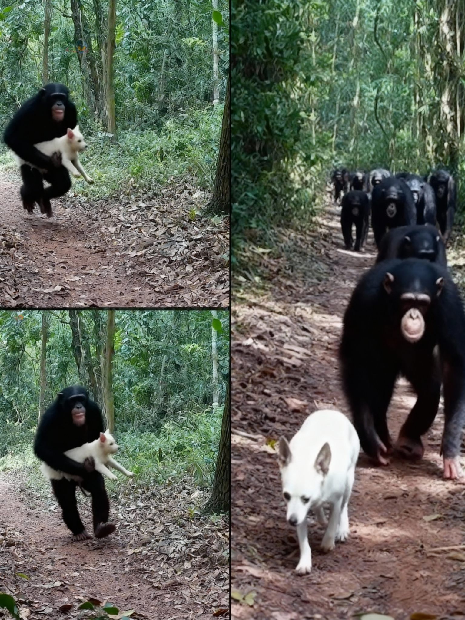 In the dense, emerald heart of the Congolese jungle, where the whispers of ancient trees guard untold secrets, a narrative far stranger than fiction began to unfold. It started with a routine patrol of camera traps, usually set to deter poachers or monitor elusive wildlife. But what primatologist Dr. Aris Thorne and his team discovered on their latest data retrieval sent shockwaves not only through the scientific community but into the very fabric of their understanding of interspecies relationships. The footage, initially dismissed as an anomaly, revealed a powerful, adult chimpanzee, later identified as ‘Moke,’ bounding through the undergrowth. In his arms, held with an almost tender possessiveness, was a small, white dog — a common village stray, known for its gentle demeanor among the market vendors. Moke’s expression, a wide, almost triumphant grin, was unmistakable. The initial reaction among the local villagers was a mixture of panic and sorrow, fearing the worst for the beloved canine, certain it had met a tragic end. Yet, this was merely the prelude to an even more astonishing chapter.