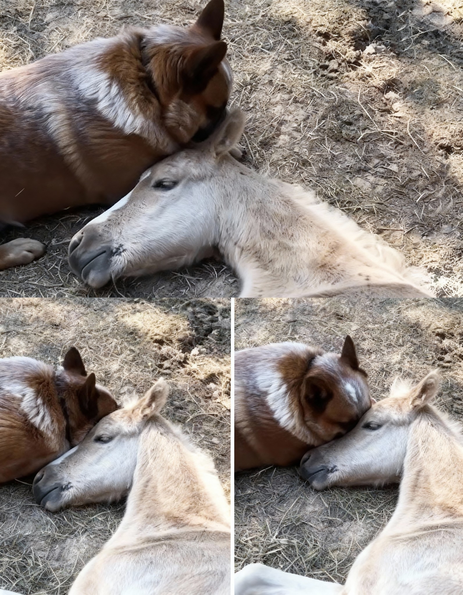 What unfolded over the next 48 hours stunned even the most experienced hands. Daisy refused to leave Charlie’s side, curling her body around him during chilling nights when temperatures dropped to 4°C (39°F). She nudged him to his feet when his legs buckled, guided him to the water trough with soft vocalizations, and—most astonishingly—positioned herself between the foal and the farm’s curious cattle, growling low until they backed away. “I’ve seen dogs herd horses,” said head farmer Tom Hargrove, “but never adopt one. Daisy appointed herself his mother, plain and simple.”