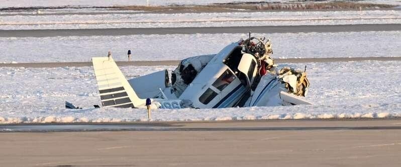 Photographs and video footage from the scene showed the aircraft with significant front-end damage resting in snow near a runway. Due to the extent of the damage, the aircraft’s full registration number—often referred to as the “N-number”—was not clearly visible.