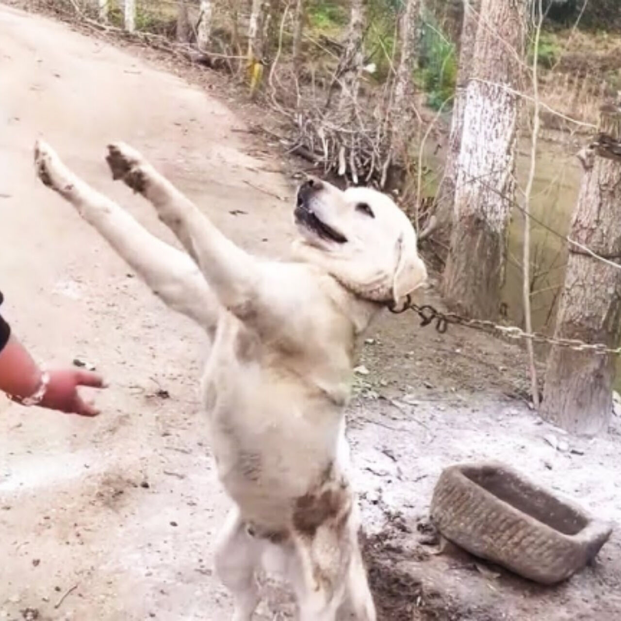 Chained to a tree with barely any room to move, the Labrador’s only escape was to stretch his paws toward anyone who came near.