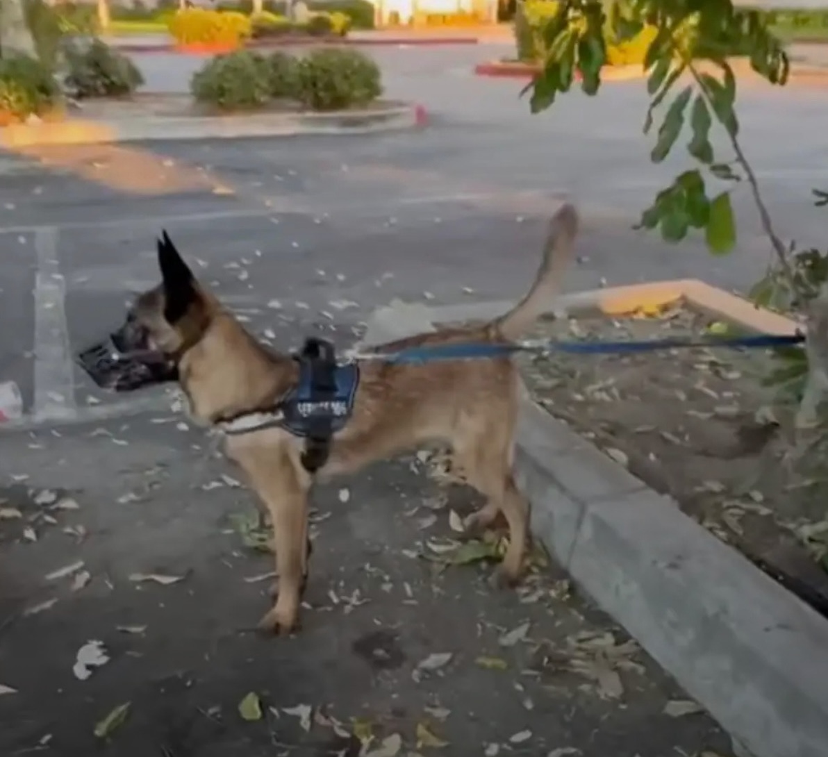 In Los Angeles, a woman witnessed a heartbreaking scene: a family sadly tied their German shepherd-Malinois mix, Melody, to a tree in an empty parking lot, muzzled her, and walked away.