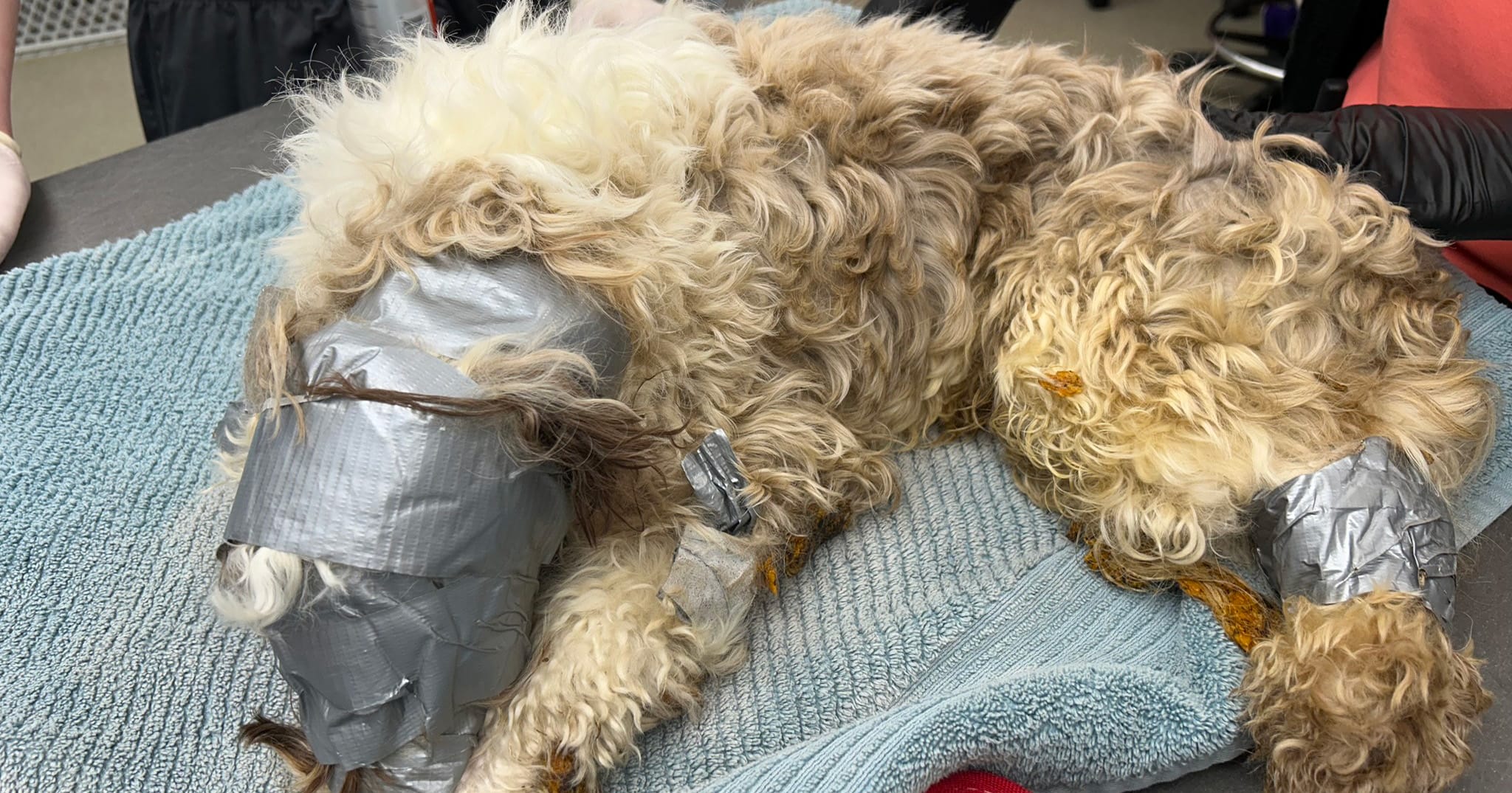 The dog was in an unbelievable condition: his head was entirely wrapped in duct tape, as was his tail, and his legs were taped together. He also reportedly had “food and other debris caked in his fur.”