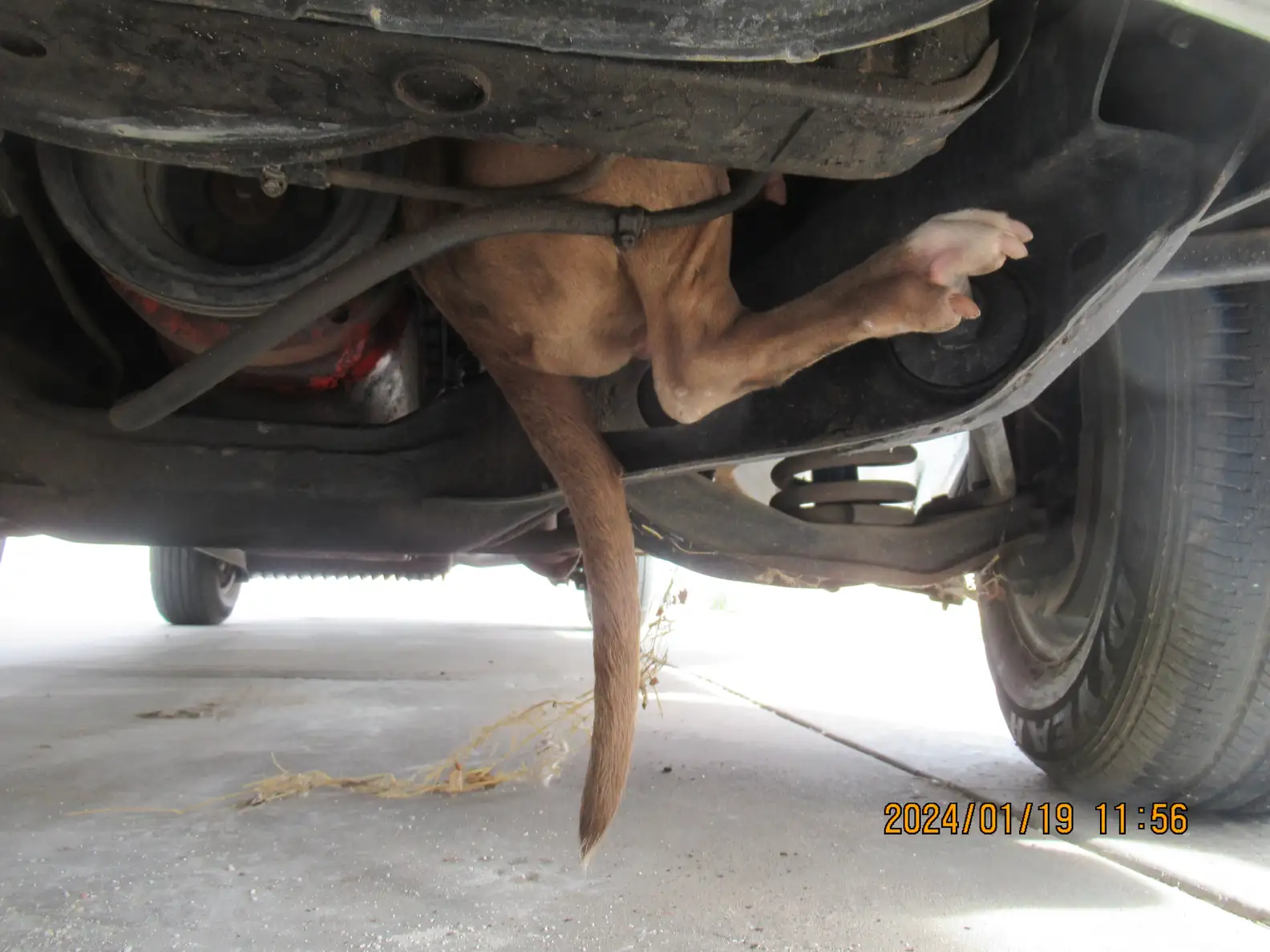 When a woman heard barking outside her house, she checked her security footage and saw someone run under her car—but never come out. Curious, she looked under the car and found a dog stuck in the engine compartment.