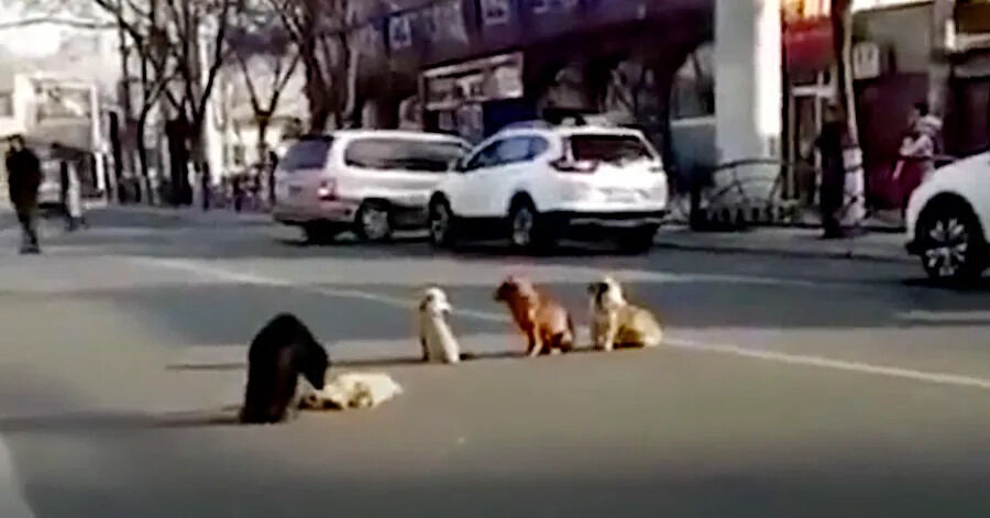 The pup was [st.ru.ck] [by a car] after crossing a road in China. His [li.fele.ss bo.dy] remained in the middle of the street as cars kept driving around it.
