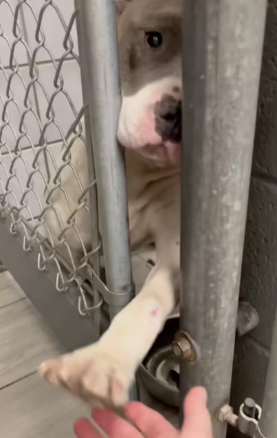 EMOTIONAL MOMENTS WHEN LONELY SHELTER DOG REACHES PAW THROUGH BARS TO HOLD HANDS WITH EVERYONE SHE MEETS