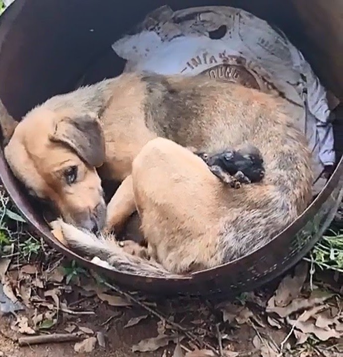 Posted on November 15, 2025 By dyjqt No Comments on Eyes filled with pain: Stray mother gives birth in the garbage, fights disease and hunger for her puppies…
