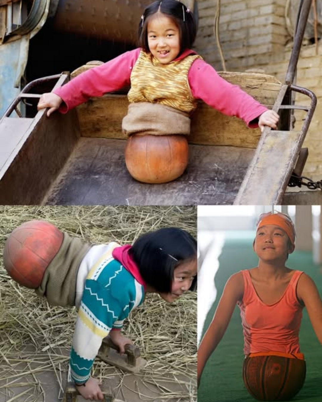 But resilience often takes root in the simplest, humblest ways. One day, Qian’s grandfather found an old basketball. With resourcefulness born out of love and necessity, he cut it in half, attached two small wooden handles, and fashioned a crude mobility aid. Placed inside the ball, Qian balanced her small body against its rounded surface and began to move using only her hands.