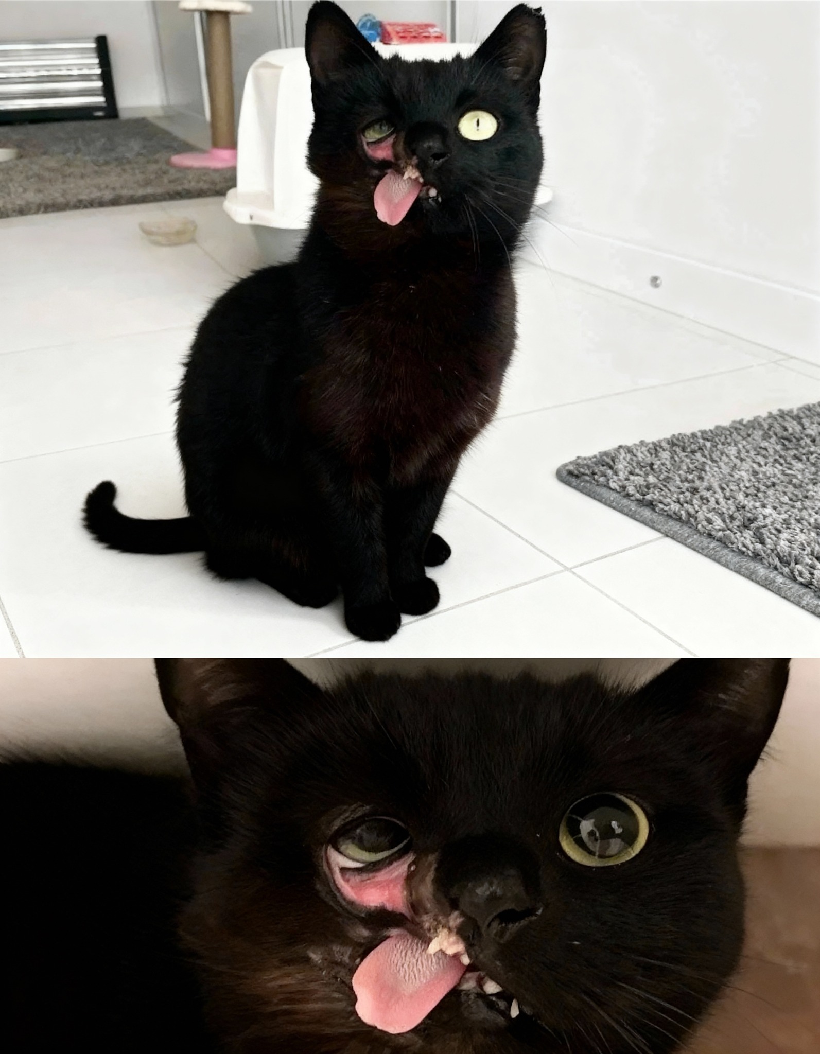 But the real shock came at the adoption event. Dozens of cats meowed and pawed at cages, yet Raven—now missing an eye, with a slightly crooked smile and a tongue that still peeked out—stole the show. A retired couple, drawn to her calm demeanor, asked to meet her. Raven didn’t cower. She walked straight to the wife, head-butted her hand, and flopped over for belly rubs. “She chose us,” the husband later said, tears in his eyes.