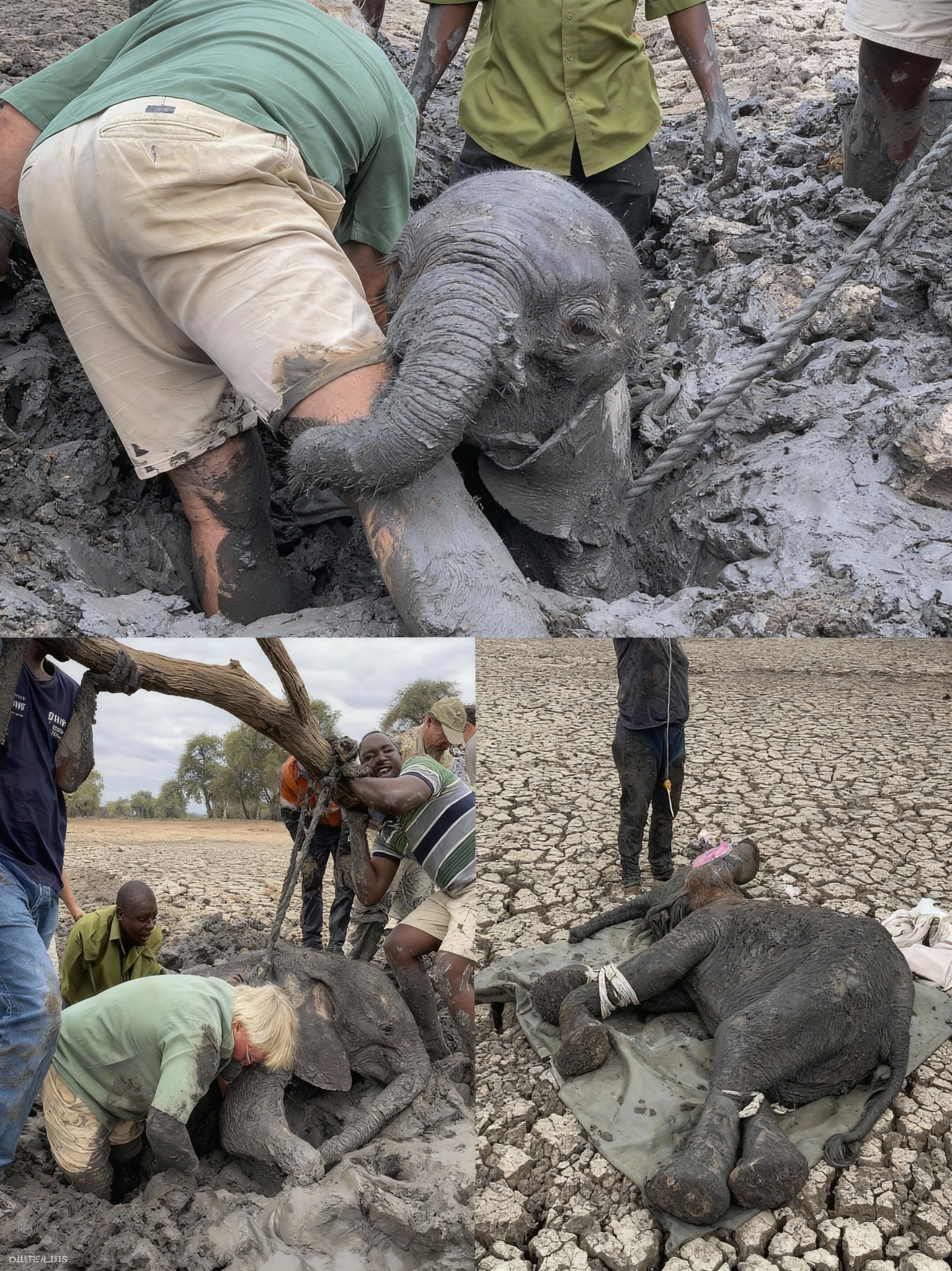 The scorching sun beat down on Hwange National Park, a relentless adversary in what was fast becoming one of the region’s most severe droughts. The once-lush landscape was now a cracked canvas of parched earth, and the life-giving waterholes had dwindled to treacherous mud pits. It was into one such quagmire that two infant elephants, later named Tess and Mana, had stumbled. Their tiny bodies, barely strong enough to navigate the harsh terrain, now fought a losing battle against the thick, sucking mud. Each desperate struggle to free themselves only pulled them deeper, their cries for their missing herd echoing a heartbreaking plea for help that seemed destined to go unanswered. Time was a luxury they didn’t have, and the stark reality of their predicament settled heavily over the desolate scene.