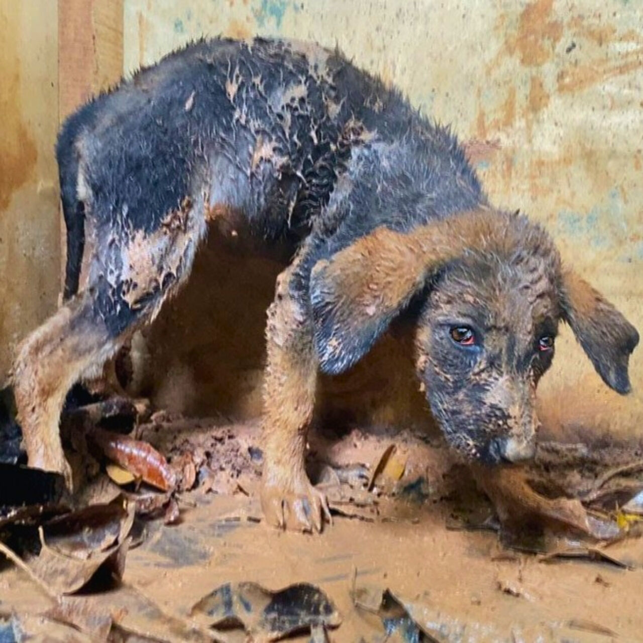 When the rescue team arrived, the sight was distressing. The puppy was huddled in a corner, its once glossy fur now dirty and tangled. Its eyes flickered between fear and the faint hope that it was finally getting the help it needed.