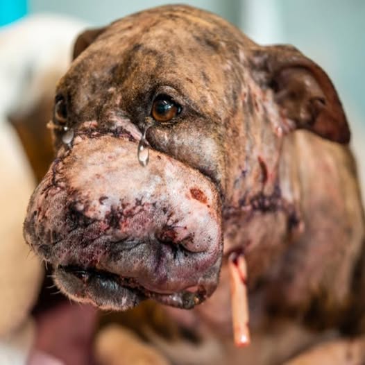 Amber’s story began in a ditch in Lancaster County, South Carolina, where a kind-hearted person stumbled upon the brindle pup, barely clinging to life.Her face bore the horrifying marks of extreme abuse—infected, torn, and barely recognizable. She needed urgent reconstructive surgery just to breathe again.