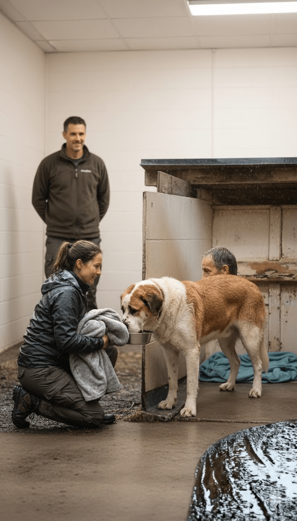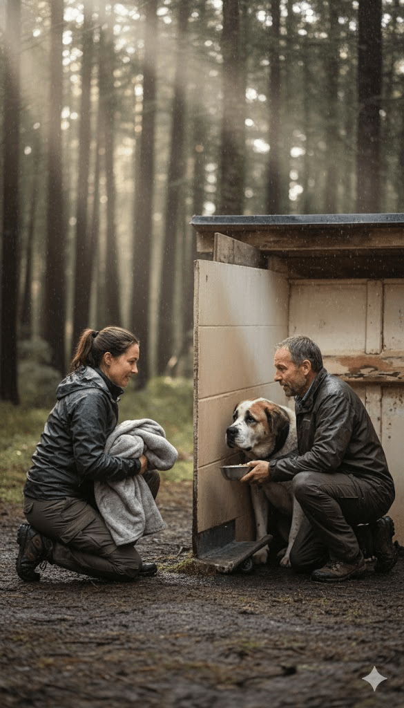 The downpour was relentless that Tuesday morning, mirroring the storm brewing inside Stewart, a magnificent Saint Bernard mix whose eyes held a depth of sorrow that could break the stoutest heart. Huddled in the desolate corner of what appeared to be an abandoned lean-to, rain streaking down the grimy walls and pooling around his weary paws, he was a portrait of despair. A heavy, tattered strip of fabric, once perhaps a makeshift tether, still clung loosely around his neck, a phantom limb of his recent captivity. Days, perhaps weeks, he had endured the elements, his once-lustrous coat matted and dull, his frame gaunt beneath the sodden fur. The world had seemingly forgotten Stewart, leaving him to the mercy of nature’s indifference and the haunting specter of an unknown past. But fate, as it often does, had a curious twist in store for this forgotten soul.