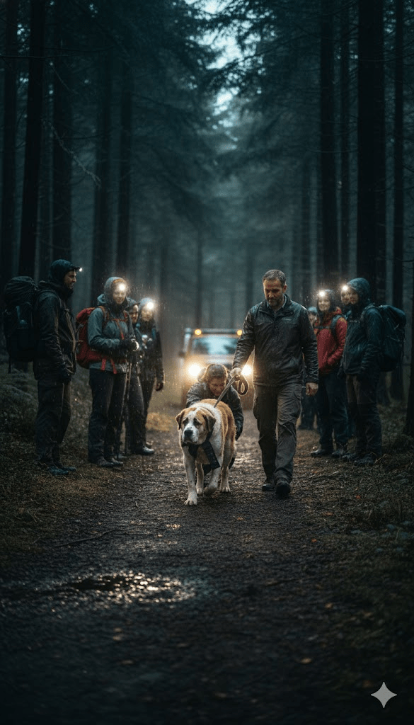 Stewart finally took a tentative sip of water, his large tongue lapping at the bowl as if it were the most precious elixir. This small act was a monumental breakthrough. With the immediate threat of dehydration averted, the next challenge was to get him out of the woods. Stewart, despite his size, was surprisingly agile when he needed to be, bolting deeper into the undergrowth whenever the rescuers moved too quickly. It was almost dark when a stroke of luck occurred. A group of hikers, lost and disoriented, stumbled upon the scene, their presence inadvertently distracting Stewart enough for Ben to finally slip a lead around his neck. It wasn’t the ideal rescue, but it was a rescue nonetheless. They carefully led the colossal dog through the dense forest, the hikers helping to clear the path, until they reached the waiting rescue vehicle.