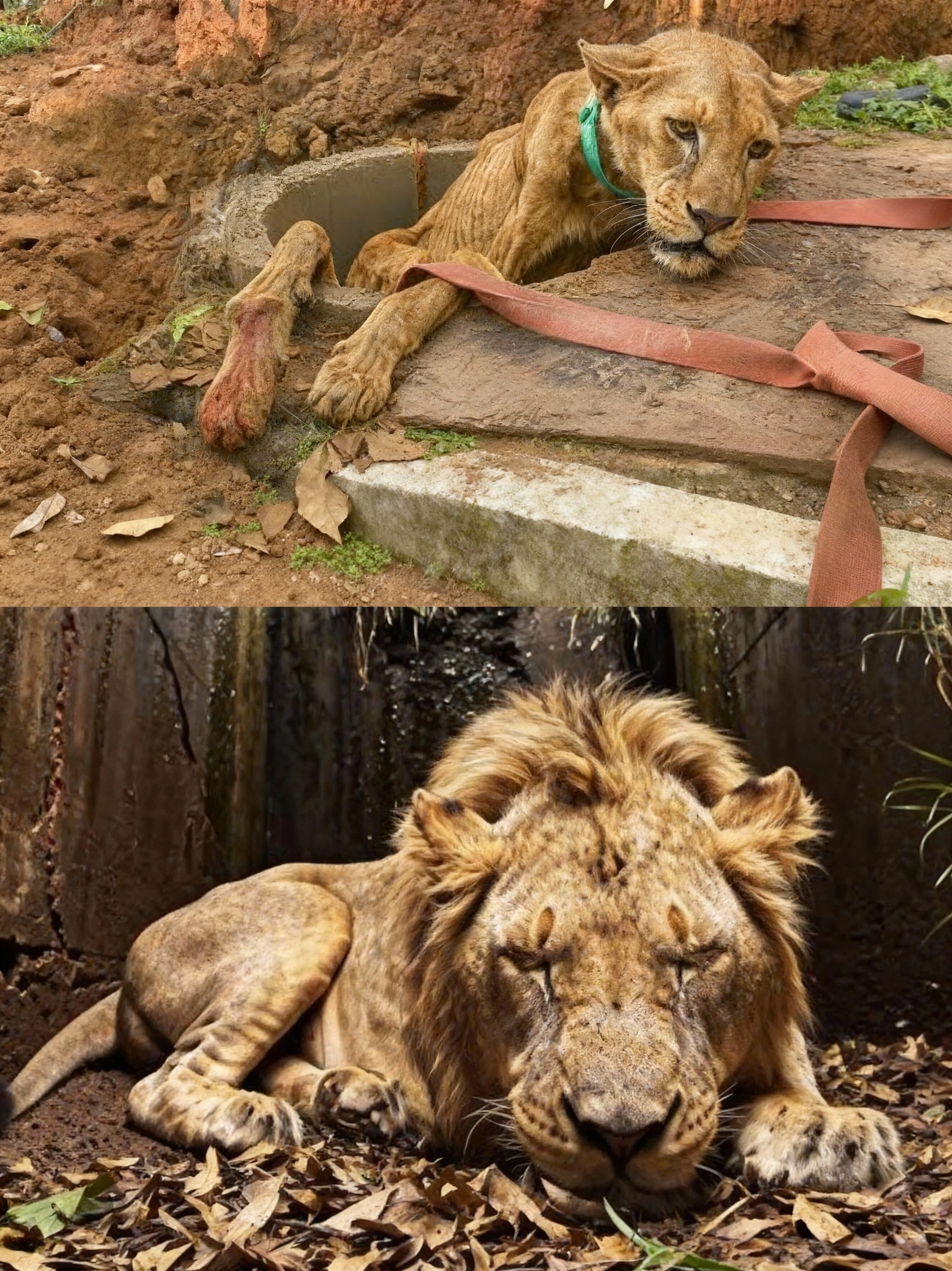 The vast, unforgiving savanna often dictates a brutal truth: only the strong survive. For years, a magnificent lion, his mane a testament to countless battles and his roar echoing authority, reigned supreme. But time, the ultimate adversary, caught up. Younger, more aggressive rivals emerged, and in a heart-wrenching twist of fate, the aging king was cast out, left to wander the periphery of his former dominion. His once-powerful body, now frail and scarred, struggled to find sustenance. One scorching afternoon, weak from hunger and exhaustion, he stumbled into a forgotten well, its dark maw swallowing his last vestiges of hope. His feeble roars, once commands, were now desperate pleas, barely audible above the whisper of the wind. It seemed his majestic life was destined to end in a tragic, ignominious fall.