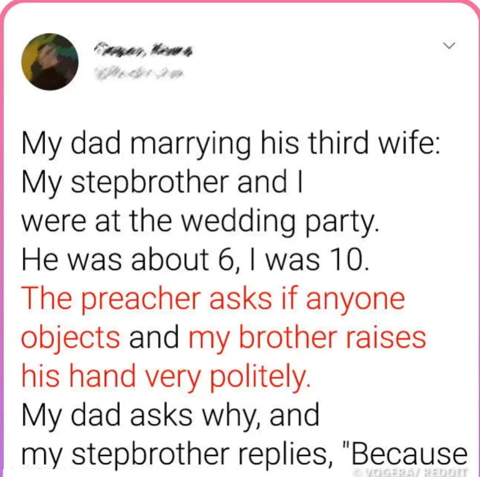 My stepbrother and I were in the wedding party. He was about 6, I was 10. The preacher asks if anyone objects and my brother raises his hand very politely.