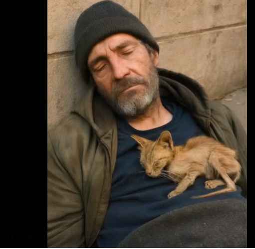 I first saw him outside the 24-hour laundromat, curled up on that ripped camping mat like it was a five-star mattress. The cat—small, orange, missing half an ear—was draped across his chest, rising and falling with every slow breath he took.