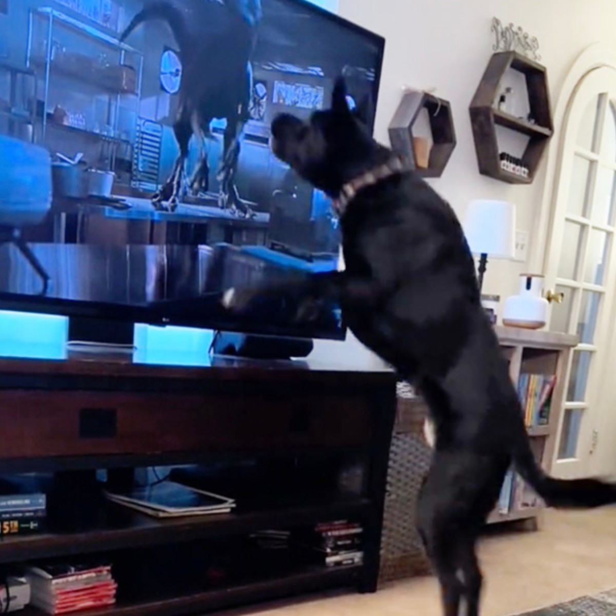 While watching Jurassic Park at home, Bosco didn’t just notice the TV — he got fully involved. During a tense scene where kids are trapped with velociraptors, Bosco sprang into action, trying to protect them from the danger on screen.