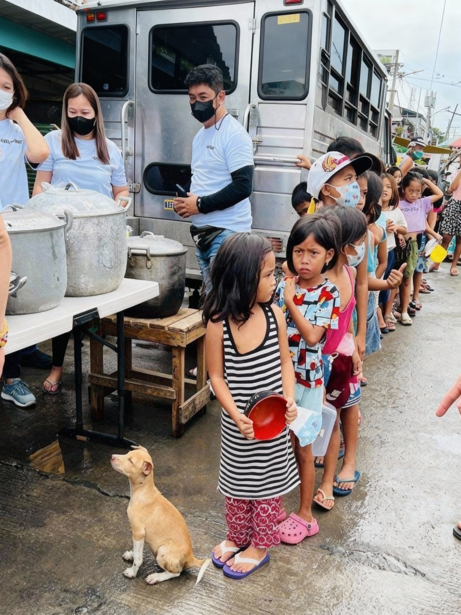 The sweltering heat of a Southeast Asian afternoon bore down on a scene both heartbreaking and hopeful. A line of children, their faces a mix of anticipation and weariness, stretched along a dusty street. They clutched worn bowls and plates, their small frames testaments to lives lived on the fringes of plenty. Amidst their quiet murmurs and shuffling feet, an unexpected figure stood out: a small, unassuming puppy, its light brown fur blending with the muted tones of the street. It sat patiently, not barking, not begging, but simply waiting, its eyes fixed on the makeshift food station where volunteers diligently served warm meals from large, steaming pots. This wasn’t just a queue for food; it was a tableau of resilience, a silent narrative of shared vulnerability between humans and animals, all bound by the universal language of hunger and the glimmer of hope for a single, sustaining plate.