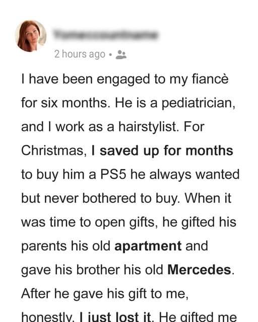 When I stepped aside to calm down, Ben followed me and said it was “just a joke.” But to me, it wasn’t funny at all. It wasn’t about the gift itself — it was about respect. That night, I left and spent Christmas at my mom’s house, where I realized this relationship had deeper problems.The next day, Ben showed up with a “real gift,” a small box, and apologized. But I told him it wasn’t about the present. I couldn’t marry someone who didn’t value me, so I ended the engagement.
