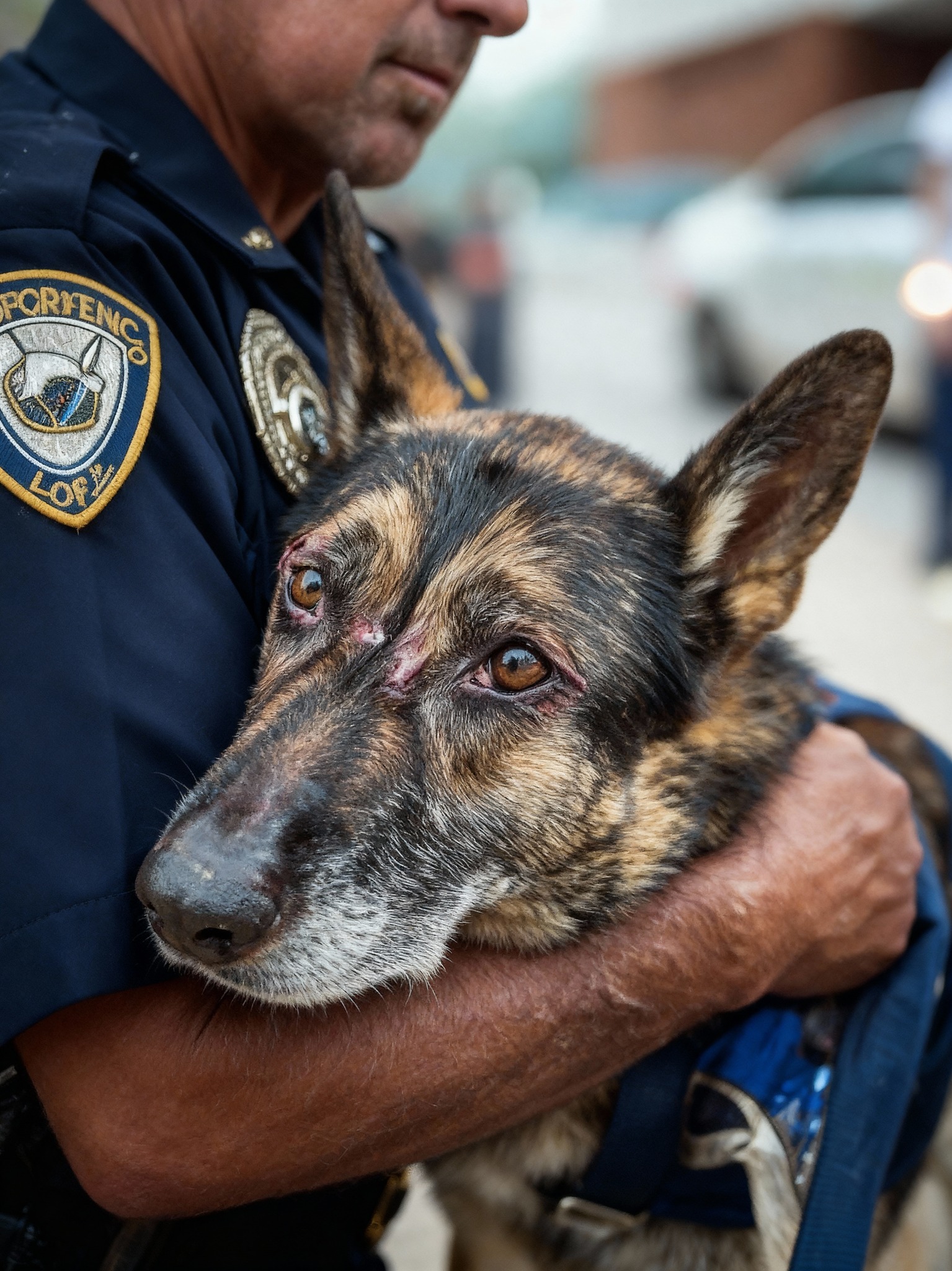 The air hung heavy with the acrid scent of smoke and shattered glass. Officer Miller, his face grimed, tightened his grip on Valor’s harness. Valor, a German Shepherd whose eyes held the wisdom of countless patrols, tracked the scent of the arsonist through the ravaged remains of what was once the city’s oldest library. They had been on this case for weeks, a string of seemingly random arsons plaguing the community, each leaving a deeper scar. Tonight, however, felt different. A tip, anonymous and whispered, had led them to this desolate warehouse district, a place where shadows played tricks and every creak of metal felt like a gunshot. Suddenly, Valor let out a low growl, his hackles rising, his focus drawn to a flickering light in the distance. They were close. Too close. The quiet apprehension that had settled over Miller intensified, a premonition of danger he couldn’t shake. He knew Valor would stand by him, as he always had, but the stakes felt higher than ever before. This wasn’t just another arrest; this was personal.