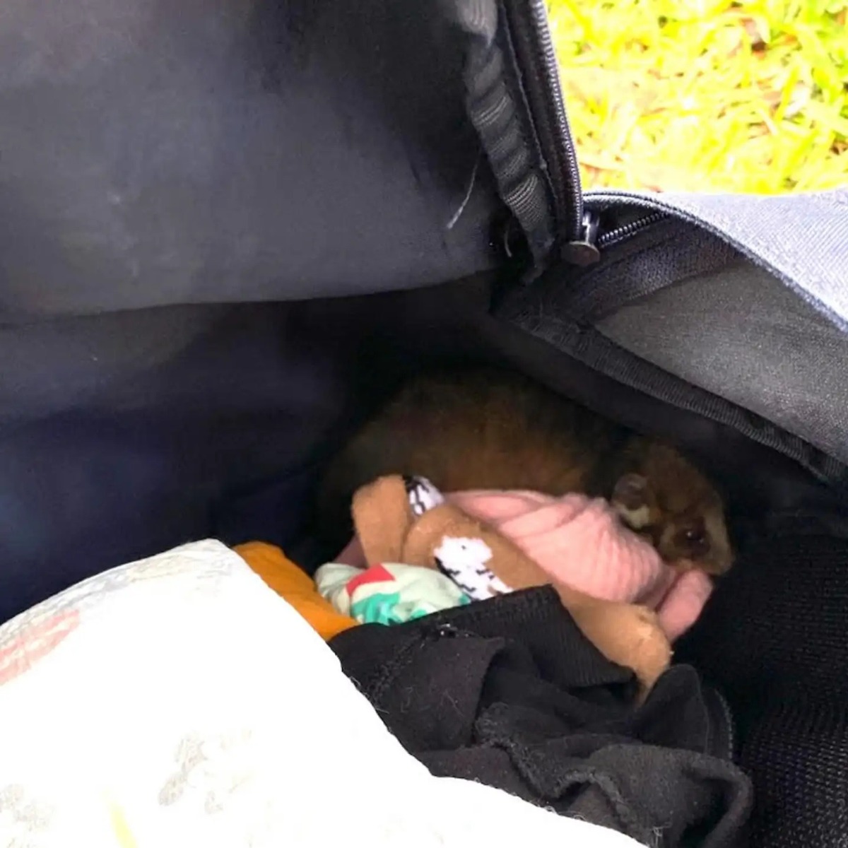 While spending time outdoors in Sydney, Australia, Jessica placed her diaper bag under a stroller — not realizing a baby ringtail possum had crawled inside for warmth.