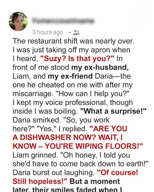 Liam, however, grew distant. I thought he was grieving in his own way — until the day I came home early and found him with Daria. Heartbroken, I quietly asked them to leave, changed the locks, and filed for divorce. Liam and Daria stayed together, even posting vacation photos online just a week later. It hurt deeply, but I unfollowed them and focused on rebuilding my life. The divorce was tough, but I managed to keep the house and later sold it to start fresh. With determination and the help of an investor, I opened my own restaurant, Gracie’s Table, which soon became a huge success.