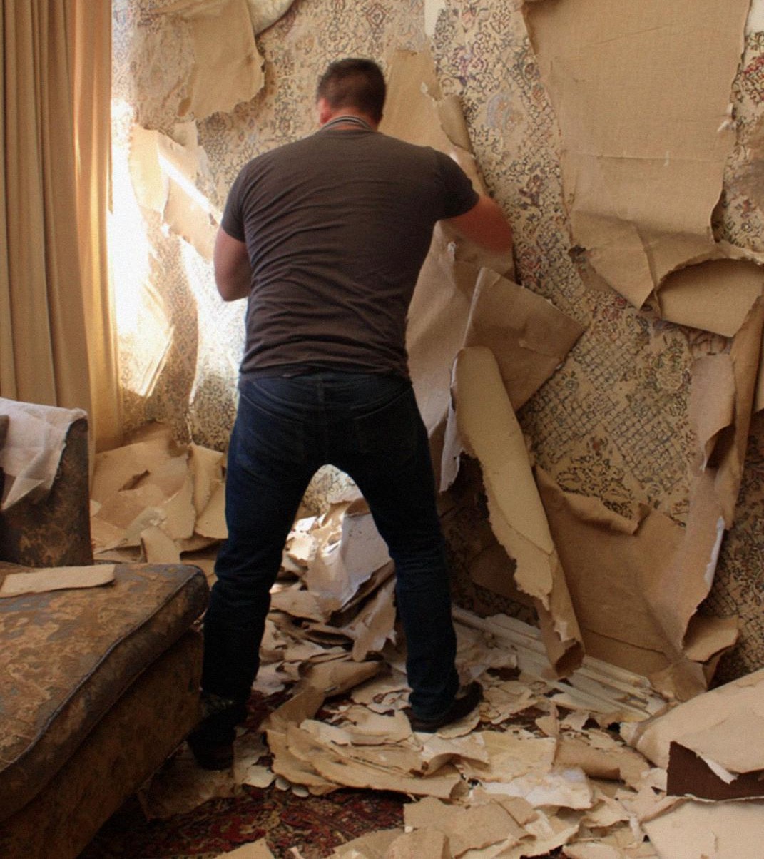 He paused, fingers still gripping the half-peeled strip of wallpaper. His shoulders lifted slightly, then fell again, as though the weight of it all had briefly touched him before sliding off.