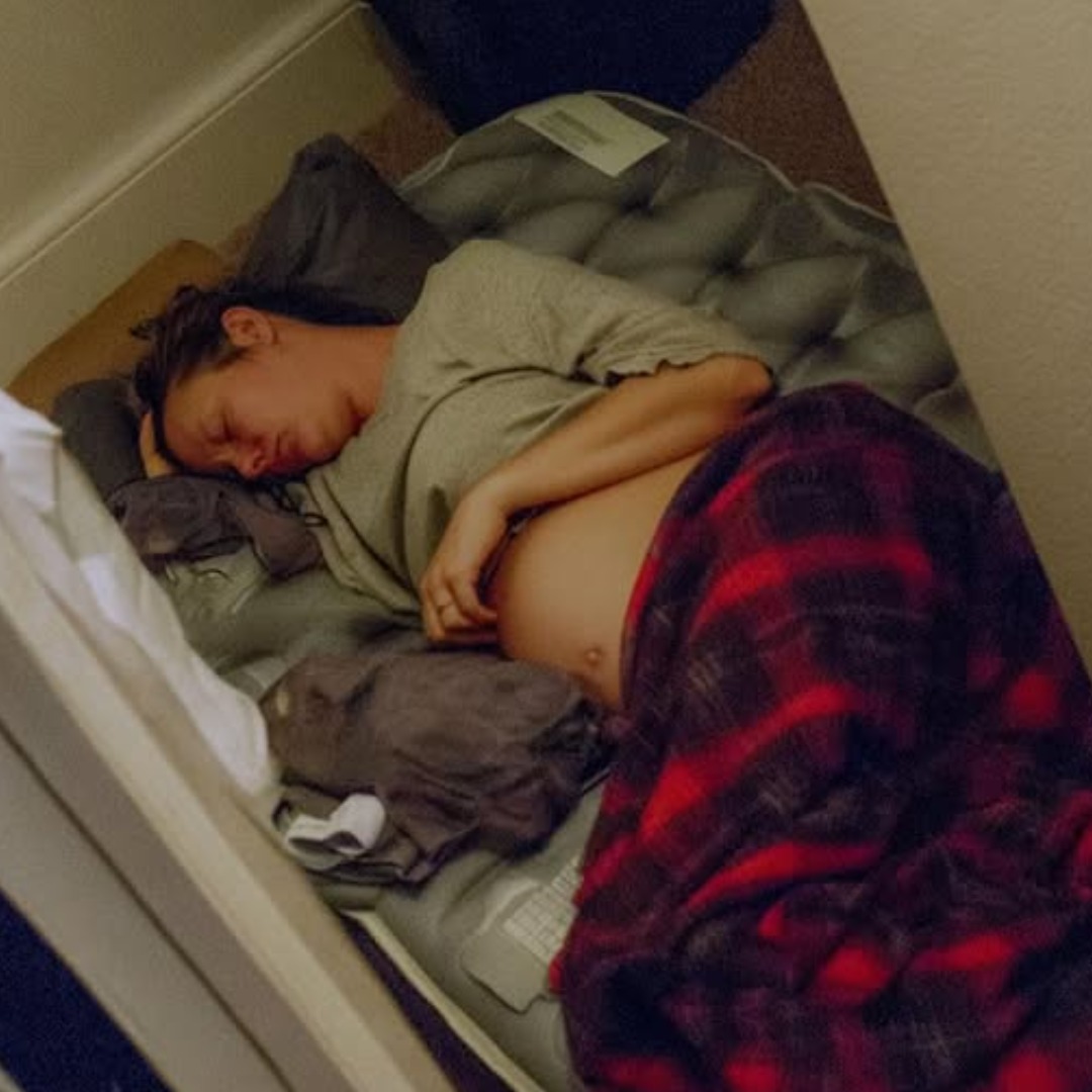She was curled up on a thin, squeaky air mattress, one of those emergency ones you throw together for camping trips or unexpected guests. Her blanket had slipped halfway down her belly. She looked uncomfortable, her face tight and restless even in sleep.