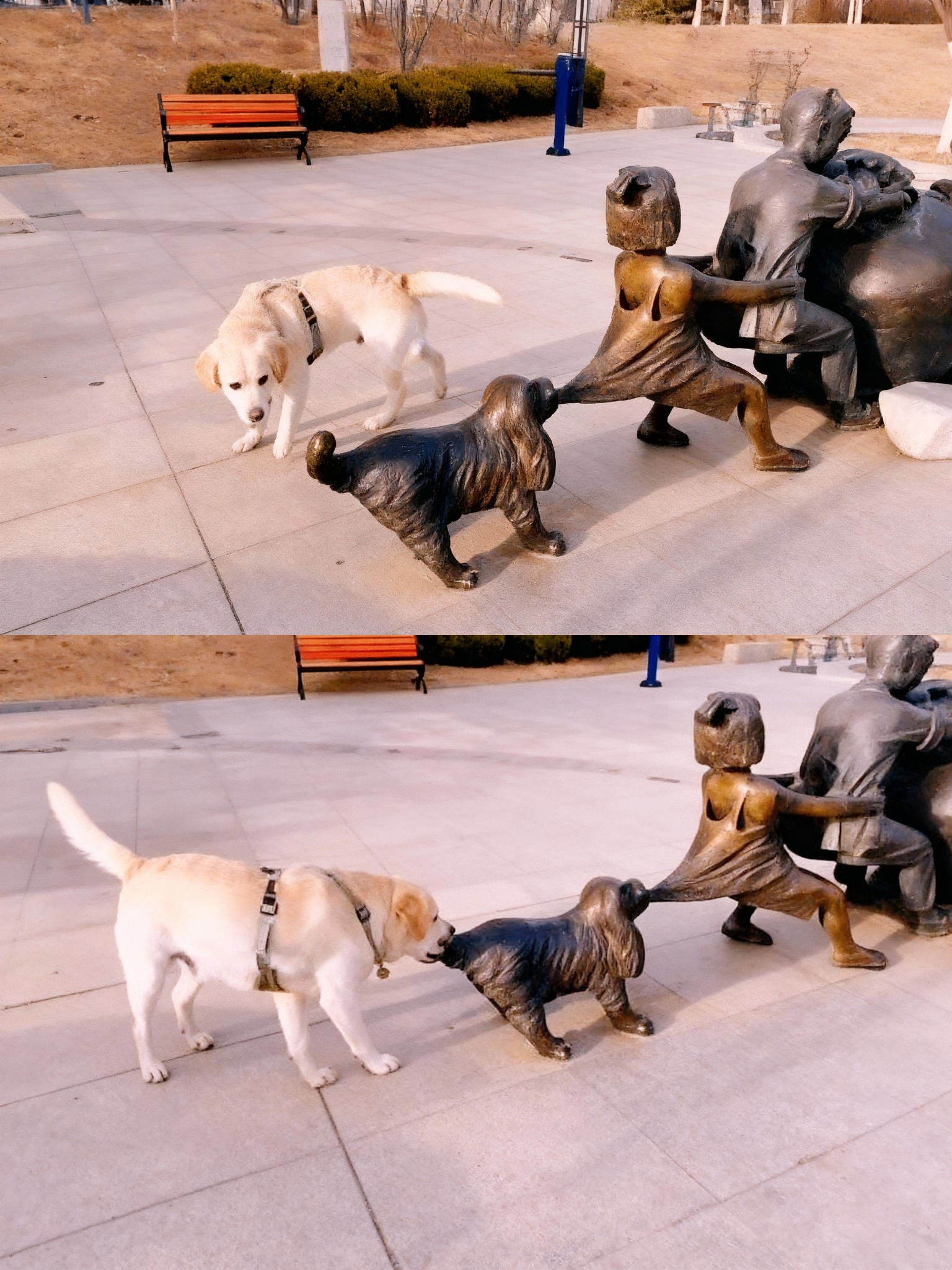 As the golden retriever initially approached the sculpture, its body language was a classic mix of canine curiosity. Ears perked, tail wagging with a tentative rhythm, it seemed to be assessing this new, unmoving “dog” in its territory. The statue, depicting a dog-like figure seemingly interacting with a human sculpture, must have presented a fascinating puzzle for our real-life canine adventurer.