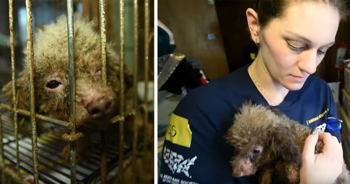 As one of the rescuers cradles the poodle, you can see her eyes adjusting to the sunlight for the first time; it’s an emotional moment.