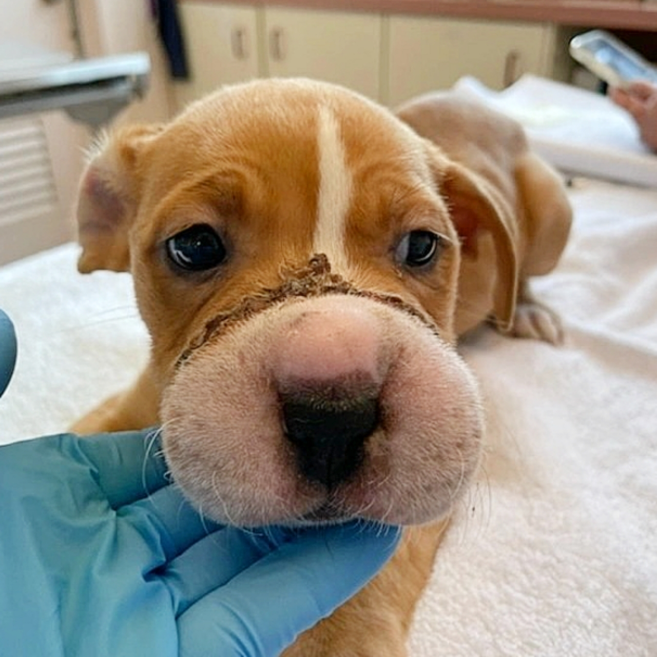 A young puppy suffered horrifying injuries after someone cruelly tied a hairband tightly around her muzzle, cutting deep into her flesh—right down to the bone.