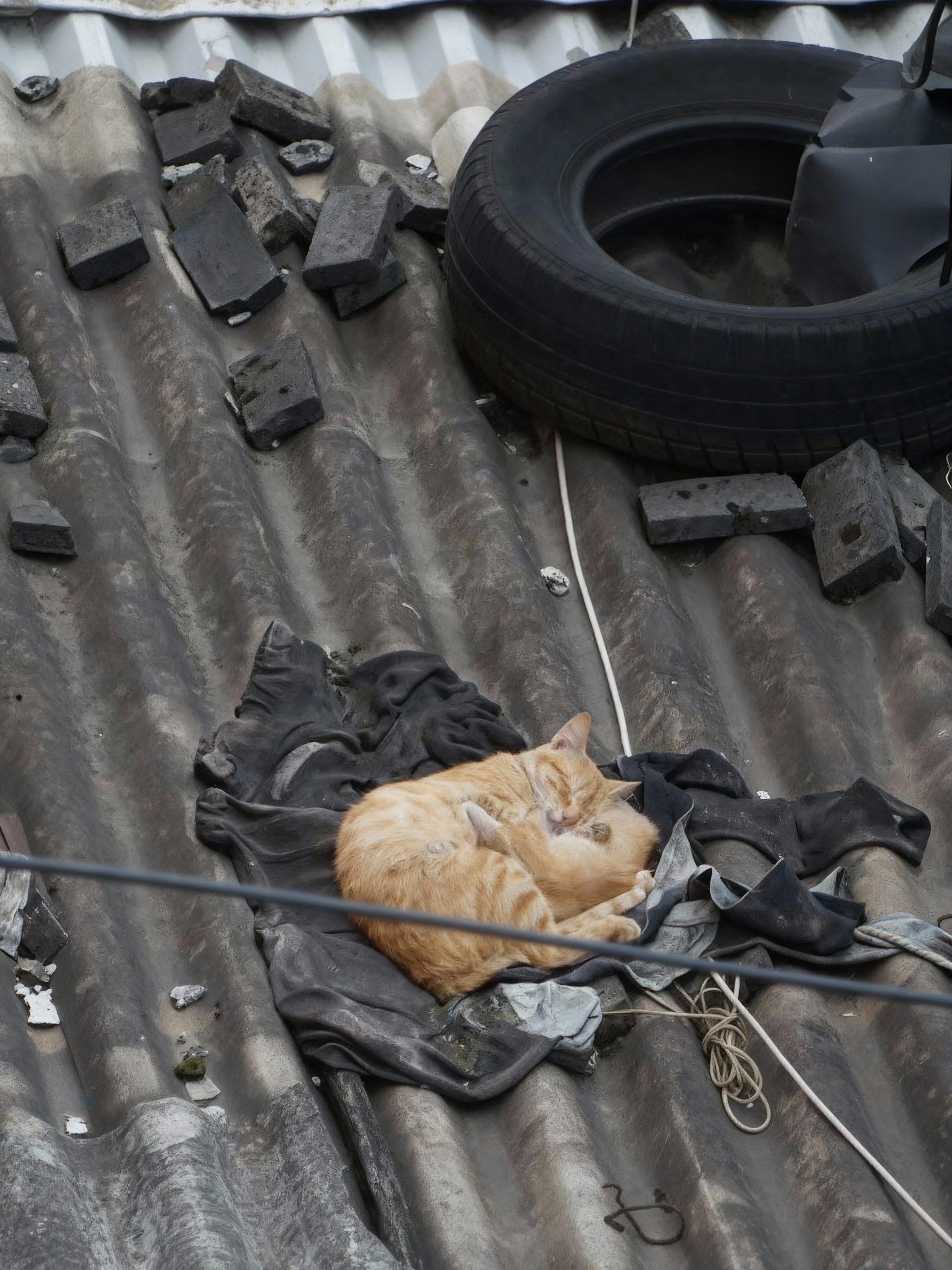In the heart of bustling urban landscapes, amidst the cacophony of city life and the relentless march of human activity, there exists a hidden world, a subculture of survival often overlooked by the hurried passerby. This world unfolds on the corrugated iron rooftops and forgotten ledges, where a surprising ecosystem thrives. Our particular focus today is on the domestic cat, Felis catus, an animal renowned for its adaptability, yet whose capacity for resilience truly shines in these elevated, often harsh environments. The image before us offers a poignant snapshot into this reality: an ginger cat, curled contentedly on a pile of dark fabric, atop a weathered corrugated roof, surrounded by debris that hints at neglect and the constant struggle against the elements. This isn’t a pampered house cat dozing in a sunbeam; this is a survivor, a testament to the enduring spirit of life finding a way, even in the most unpromising of circumstances. The tire, the loose bricks, the tangled wires—all speak to a narrative of resourcefulness, where discarded human artifacts become part of the feline habitat, offering shelter, warmth, or simply a vantage point. The very existence of this cat, seemingly at peace in its unconventional haven, prompts a deeper inquiry into the lives of urban rooftop dwellers and the unique challenges and adaptations that define their daily existence. We will delve into how these animals navigate their precarious perches, what their presence reveals about urban ecology, and how their quiet survival stories unfold, day after day, high above the streets we traverse.