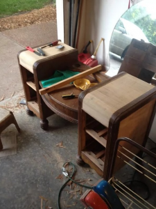 Next came sanding—lots and lots of sanding. Getting into every crack and crevice took patience, but the transformation was worth it. I kept going until the wood looked as fresh as possible, then stained it with a grain-defining finish. Because of the different types of wood, the stain created a lovely variation in color. I repeated the same process for the mirror topper, which revealed a stamp reading “Galax Va., 1942”—dating the piece back over 80 years.