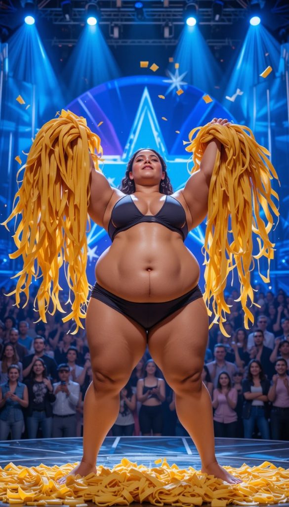 The stage lights flickered as a plump woman waltzed into view, her arms wrapped around heaps of golden pasta. She carried it like a treasure, strands slipping between her fingers as she danced. With a joyful laugh, she tossed the noodles into the air, twirling them like silk ribbons, sending waves of buttery aroma into the crowd.