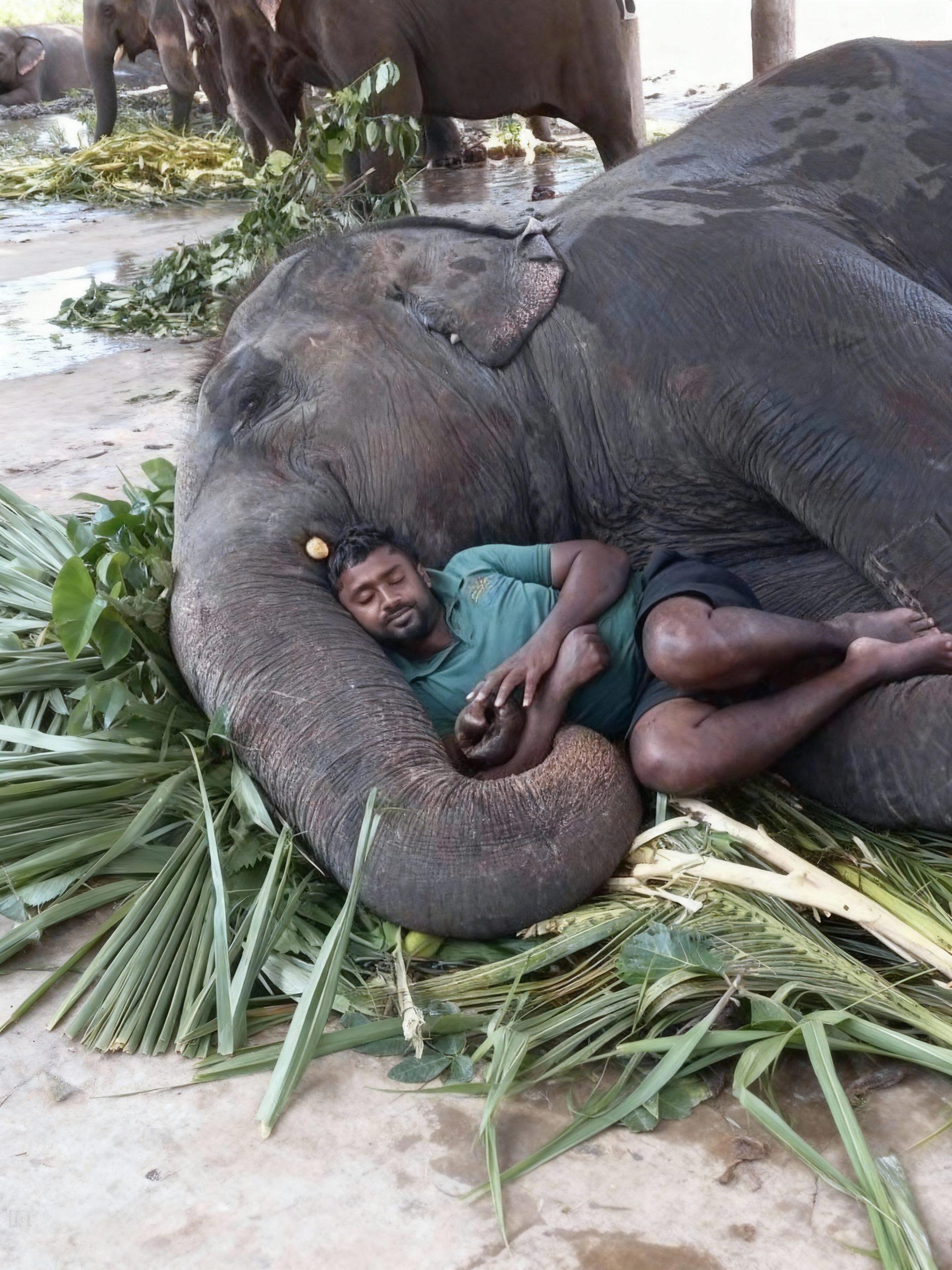 In a world often characterized by bustling human activity and the encroaching separation of species, moments of profound interspecies connection stand out as testaments to an enduring, almost ancient, form of trust. The image before us captures one such extraordinary instant: a man, seemingly at peace, nestled against the colossal head of an elephant, surrounded by a bed of lush foliage. This isn’t merely a snapshot; it’s a visual narrative of a relationship forged in understanding, care, and mutual respect. The gentle curve of the elephant’s trunk cradling the man, the shared tranquility in their posture, and the palpable sense of safety suggest a bond far deeper than that between a handler and an animal. It speaks to the essence of a sanctuary, a place where these magnificent creatures, often scarred by past traumas or the relentless pressures of the wild, find not just refuge but also companionship. This serene scene invites us to look beyond the surface, to delve into the intricate dance of human and animal welfare, and to appreciate the delicate balance required to foster such profound connections in a world where wild spaces are shrinking and ethical conservation is more crucial than ever. It prompts us to ponder the emotional intelligence of elephants, their capacity for forming intricate social bonds, and the unique role humans can play in their lives when approached with empathy and genuine devotion.