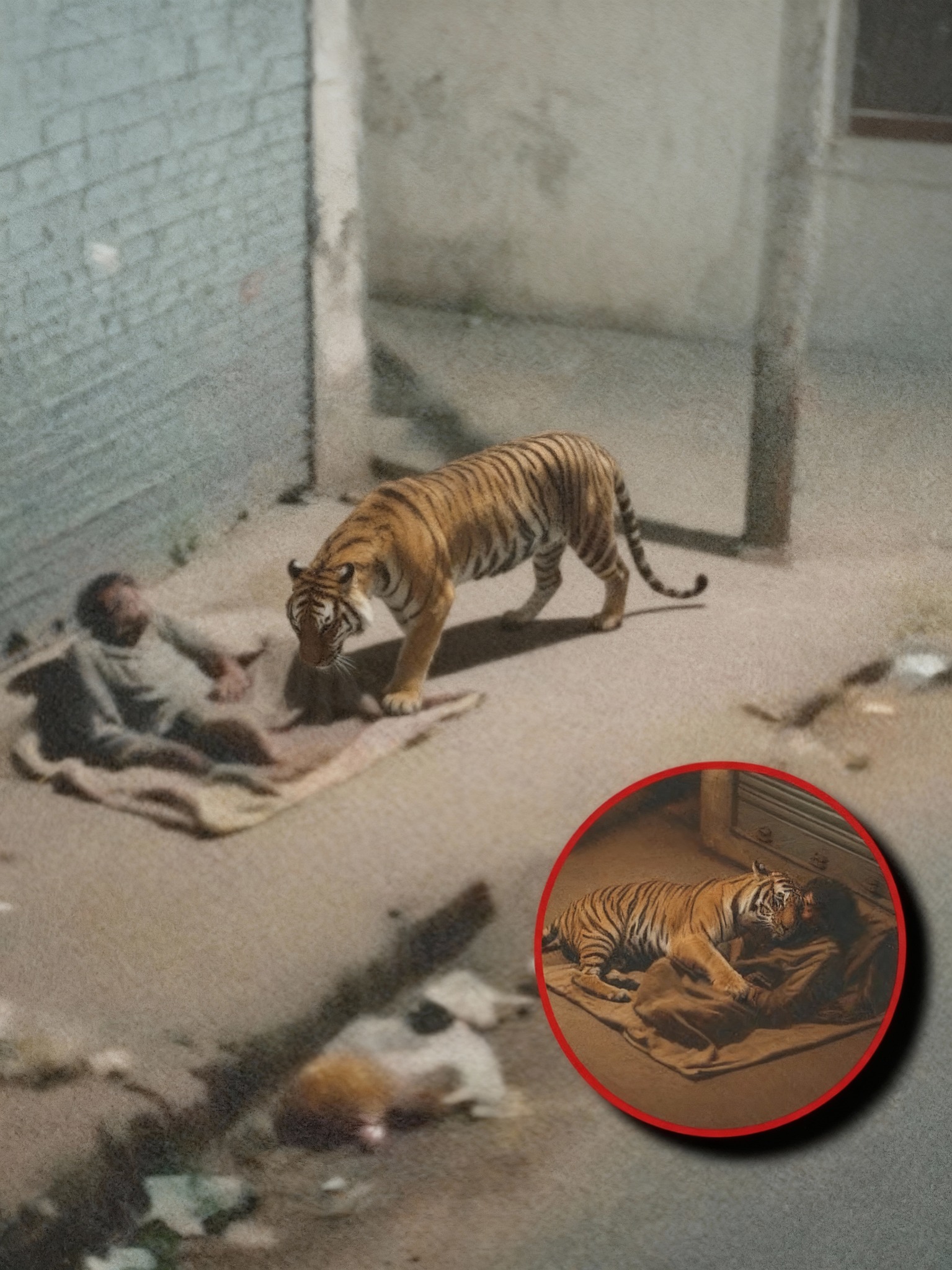 In the quiet, often overlooked alleys of a bustling metropolis, where the city’s ceaseless rhythm softens to a whisper, a tale unfolded that defies belief and challenges our perceptions of the wild. It began as a series of unsettling reports: a large tiger, a creature of raw power and untamed majesty, had been sighted roaming the urban sprawl, leaving a trail of fear and unanswered questions in its wake. Authorities scrambled, traps were set, and a collective sense of unease settled over the population, transforming familiar streets into zones of nervous caution. Yet, amidst this heightened alert, an extraordinary and deeply ironic encounter took place, far from the prying eyes of surveillance teams, involving a man on the margins of society and the very beast that had become the city’s most feared enigma. It was a night when the lines between predator and companion blurred, all under the dim, indifferent glow of a flickering streetlamp.