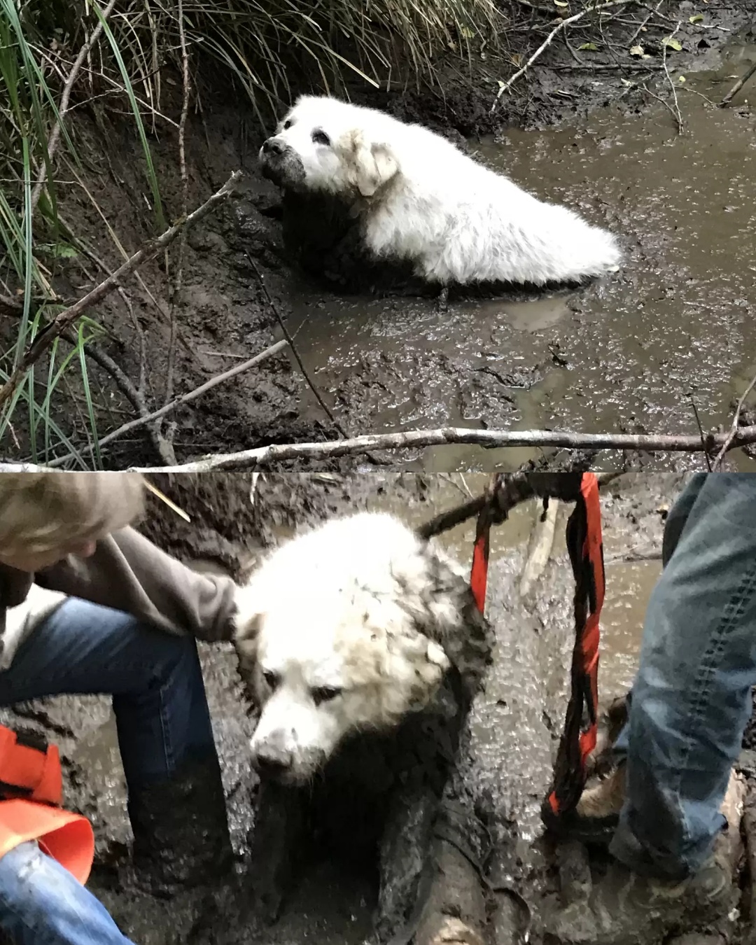 Tino stayed close, allowing Puppy to smell him, to feel safe in the presence of a fellow dog who had come to save him. Sarah, ever careful, worked quickly to help free Puppy from the sticky mud. They used ropes and tools to pull him out, but it was Tino who remained by his side, offering silent reassurance with each small movement, guiding the terrified dog to safety.