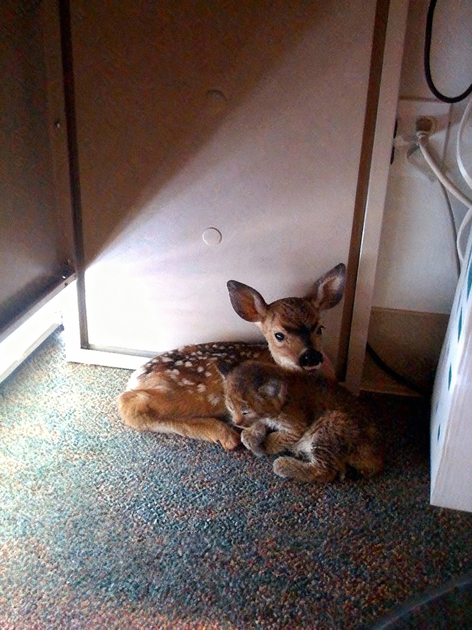 In the wake of a devastating forest fire that scorched thousands of acres, leaving behind a landscape of ash and desolation, rescue teams ventured into the smoldering remains, their hearts heavy with the task of searching for any surviving wildlife. The air was thick with the scent of smoke and despair, and the usual sounds of the forest were replaced by an eerie silence. What they stumbled upon in an unlikely sanctuary—a seemingly abandoned office building on the edge of the burned-out woodland—left them not only speechless but profoundly moved. Tucked away beneath a dusty desk, in a tableau that defied all natural instinct and expectation, lay a tiny fawn and a young bobcat, curled together in a silent embrace, fast asleep. Both were covered in the grime of the inferno, soot clinging to their fur, their small bodies trembling with residual fear, yet they found solace and comfort not in solitude, but in each other’s unexpected presence. The bobcat, usually a solitary hunter, had nestled protectively around the vulnerable fawn, and the fawn, instead of recoiling, leaned into the bobcat’s warmth, their shared, unspoken bond a testament to a survival instinct that transcended the predator-prey dynamic. This discovery sparked a glimmer of hope amidst the ruin, a powerful reminder that even in the most catastrophic circumstances, life finds a way, and connections can form in the most extraordinary ways.
