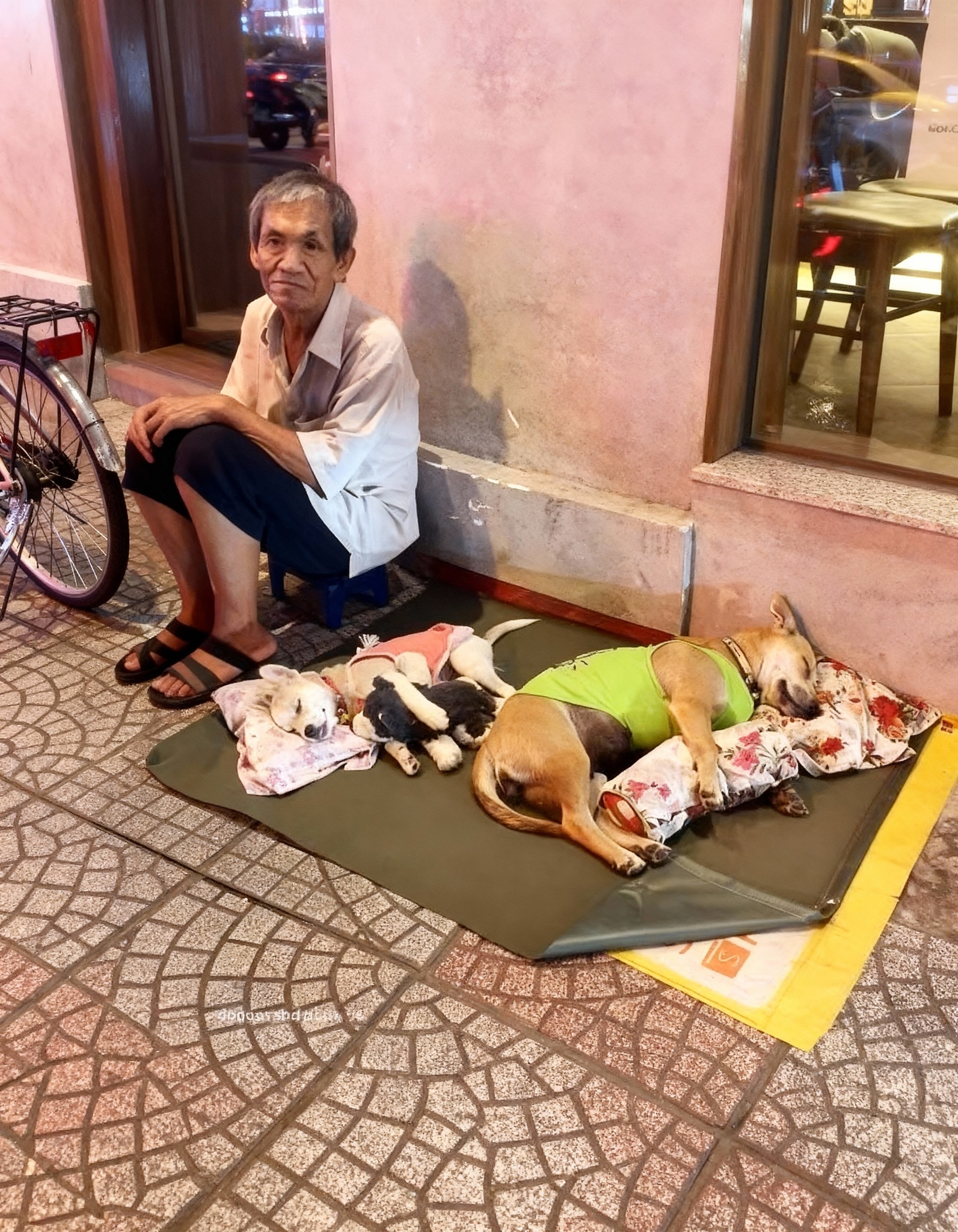 The city never truly sleeps, but on a particular stretch of urban sidewalk, amidst the ceaseless hum of traffic and distant conversations, a quiet vigil unfolds each night. It’s a scene that, to the hurried passerby, might appear as nothing more than another glimpse into the challenging lives of the city’s vulnerable. An elderly man, his face etched with the stories of countless days, sits watch. Before him, nestled on carefully arranged mats and soft cloths, are not his kin, but his chosen family: a small collection of stray dogs, sleeping soundly, utterly oblivious to the concrete cold or the clamor around them. He has no home, yet provides shelter. He has no mattress, yet offers rest. He has no luxuries, yet gives everything he has. Every night, this man meticulously prepares this small sanctuary, ensuring his companions can close their eyes feeling safe. He dresses them in tiny shirts, provides makeshift pillows, covers them gently, and then settles nearby, a silent, unwavering guardian. He asks for nothing in return, expecting no gratitude. Their calm breaths, their little stretches, their sighs of peace are the only thank you he needs. He could choose to sleep alone, to shed this responsibility, but he knows a truth many have forgotten: the love given, even to those who cannot vocalize their appreciation, is the purest form of wealth.